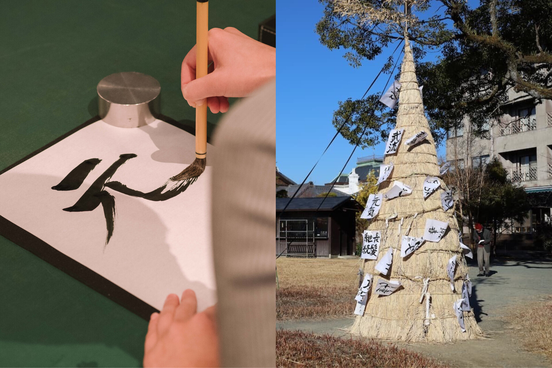 お正月といえば書き初め。御花でも、心静かに筆を取る書き初め体験をお楽しみいただけます。書いていただいた書は、お正月の締めくくりに行われる「ほんげんぎょう」にて焚き上げ、願いを天へと届けます。青竹や藁で櫓を組み、その中に門松、しめ縄、書き初め、古いお守りなどを納めて燃やし、新しい年を健やかに過ごせるよう願いを込める伝統行事です。御花でのほんげんぎょうは、お正月が明けた1月24日に執り行います。