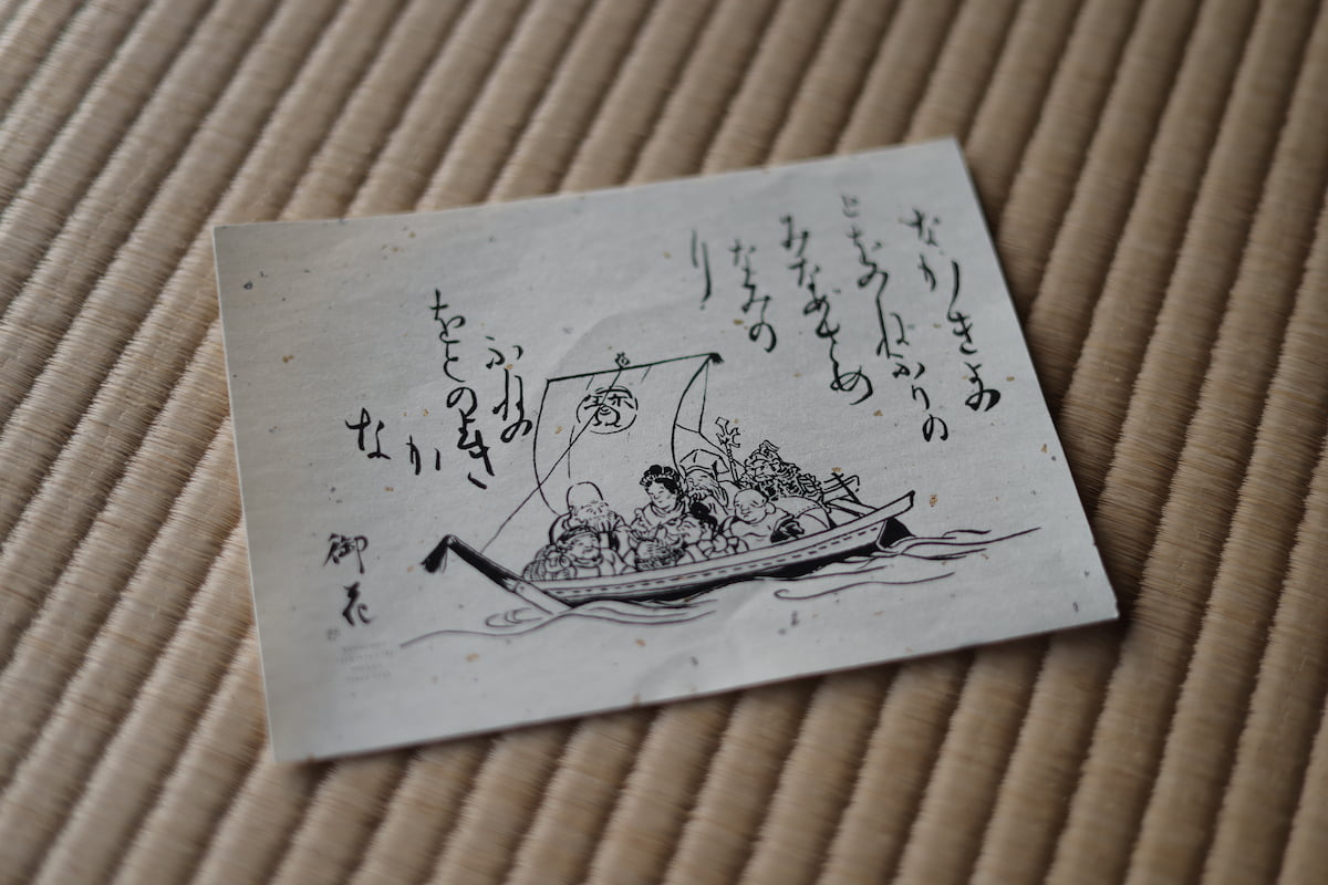 古くから新年に吉夢を招くとされてきた「夢枕」をご用意しております。七福神が描かれた夢枕を就寝時に枕元へ置き、新しい一年の幸福やご縁、豊かな運を願う御花ならではの新年のしつらえです。