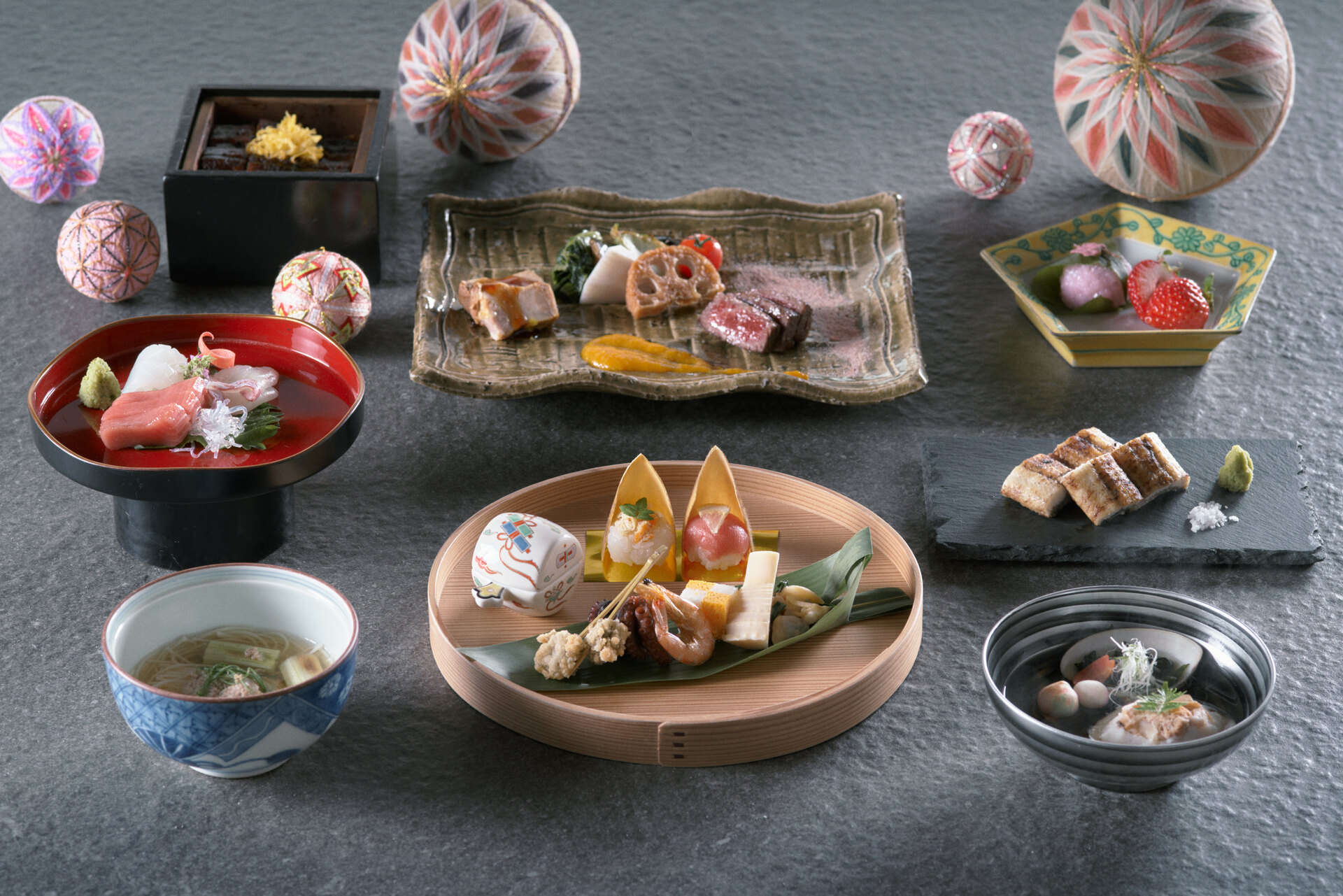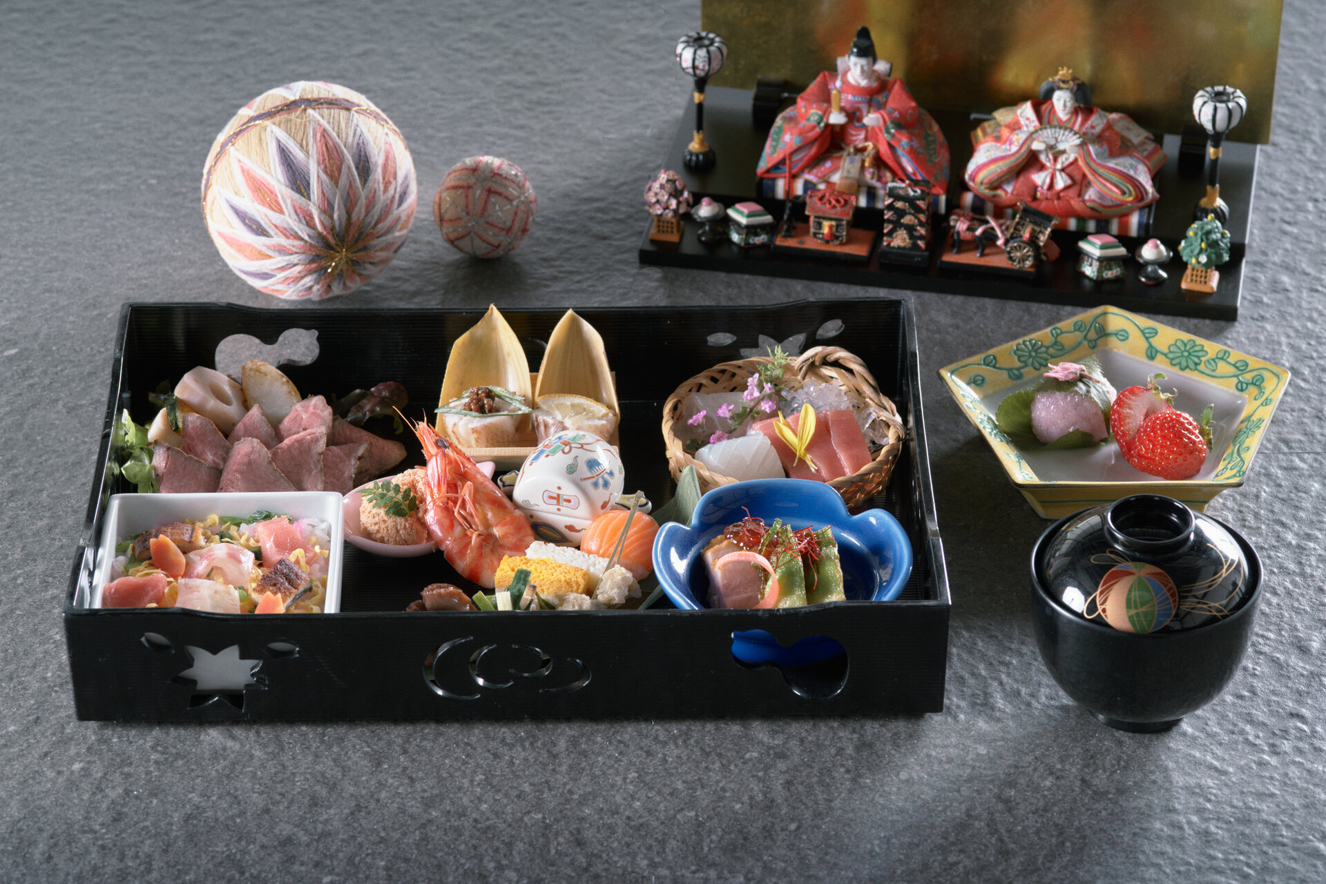 お内裏様とお雛様をイメージした前菜や大名家の婚礼調度としても大切にされてきた「貝合わせ」にちなんだ蛤のお吸い物等、桃の節句ならではの華やかな会席料理をお楽しみいただけます。また、お祝いの気持ちをぎゅっと詰め込んだ「さげもん膳」もご用意。お好みにあわせてお選びいただけます。